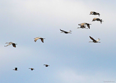 ...as did our Target Bird for the day, Sandhill Cranes!! Initially only three of them flew over our heads and we heard them calling before actually seeing them, but then more of them streamed in by the dozens, then hundreds, to spend the night in the fields, it was an incredible sight: