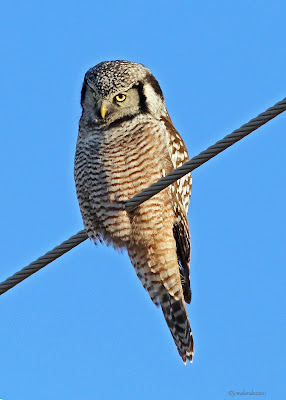 So John, Doug, and I made one last ditch effort to see if the Northern Hawk Owl was perhaps out in the open before heading home, and as we drove along the road, there it was, right out in the open on a wire!! Once again John and Doug's hearing was affected by my screams, but I simmered down enough to take just a few photos: