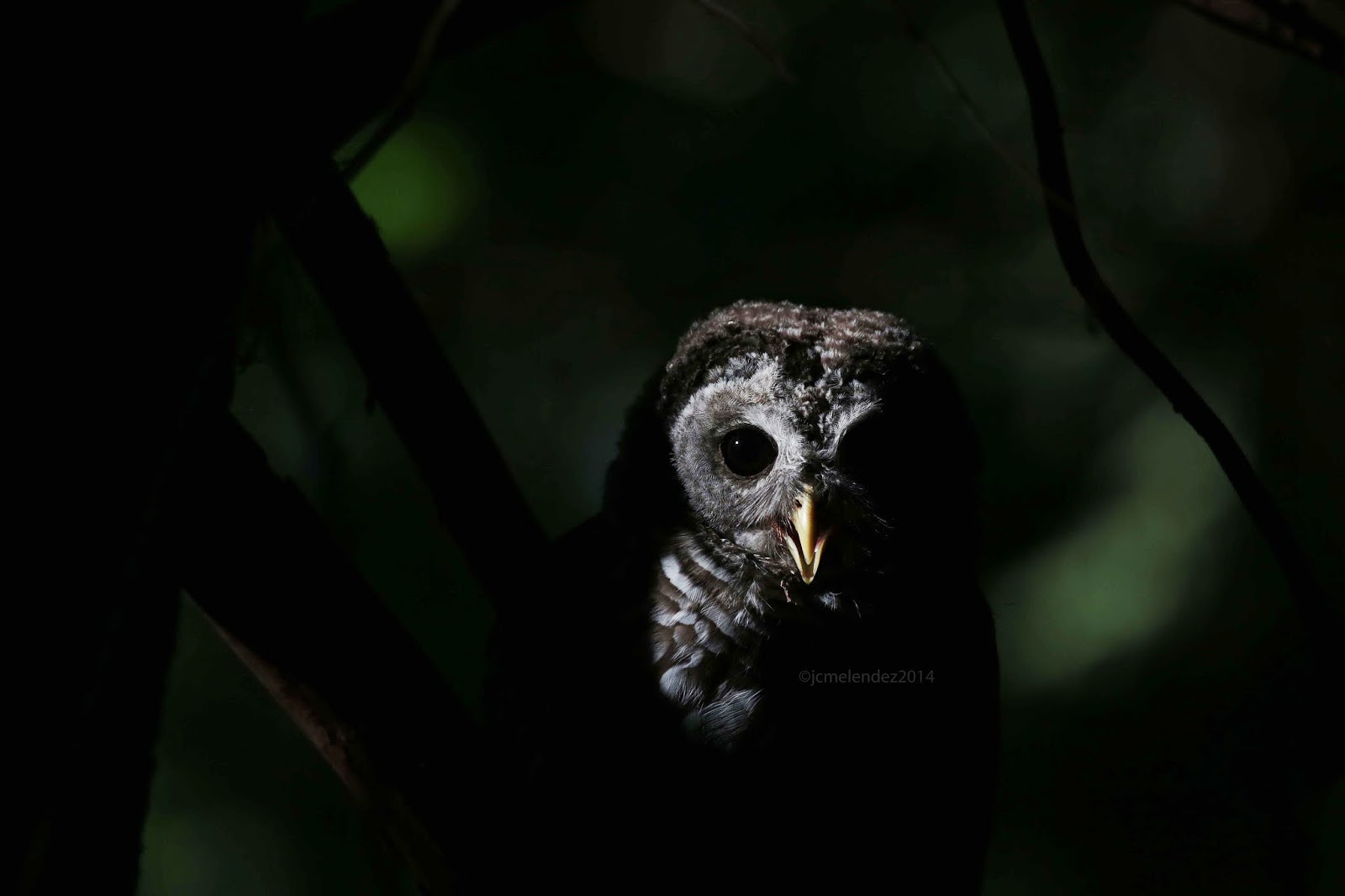 In the evening, a pair of young Barred Owls is easily found by following their begging calls, which commence as soon as a parent calls out to them: